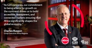 Absa has partnered with B20 South Africa as a Diamond Sponsor, and a Gold Sponsor for G20, playing an active role in shaping economic policy and amplifying Africa’s voice on the global stage. Â